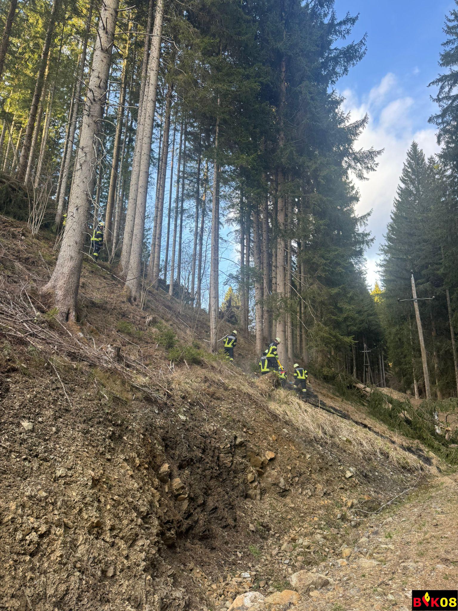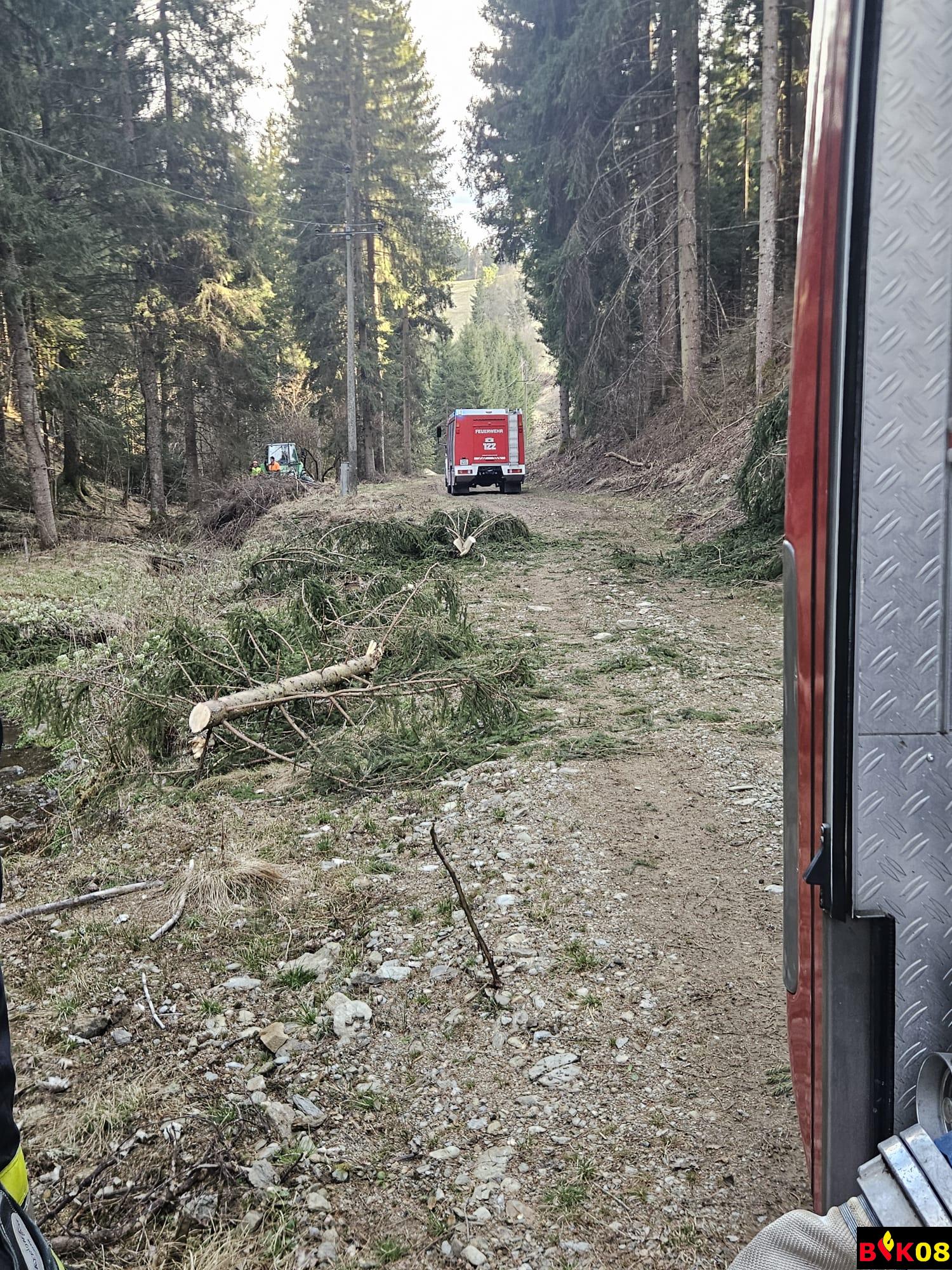 Aufgrund von heftigen Sturmböen fiel im Bereich Ratschach ein Baum auf eine 20 kV Freileitung. Durch die trockene Vegetation verursachte die Oberleitung einen Waldbrand. Bei der Anfahrt versperrte ein umgefallener Baum die Zufahrt zum Einsatzort. Dieser musste zuvor weggeräumt werden, um zum Einsatzort zu gelangen.